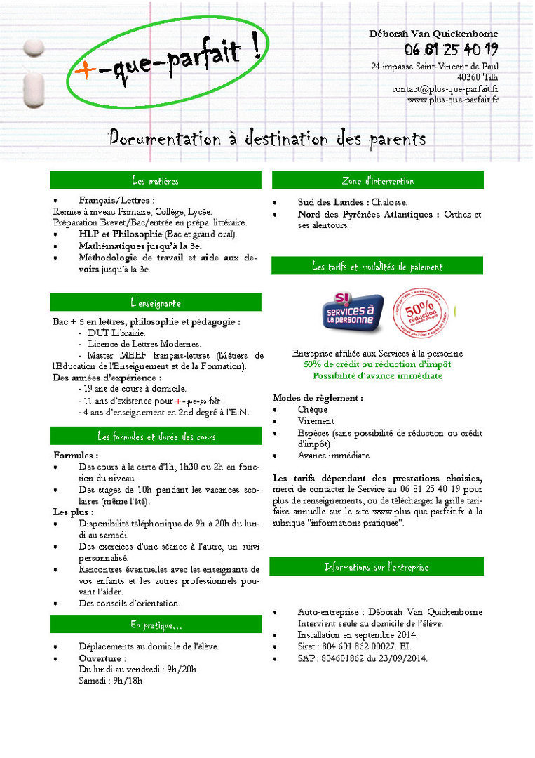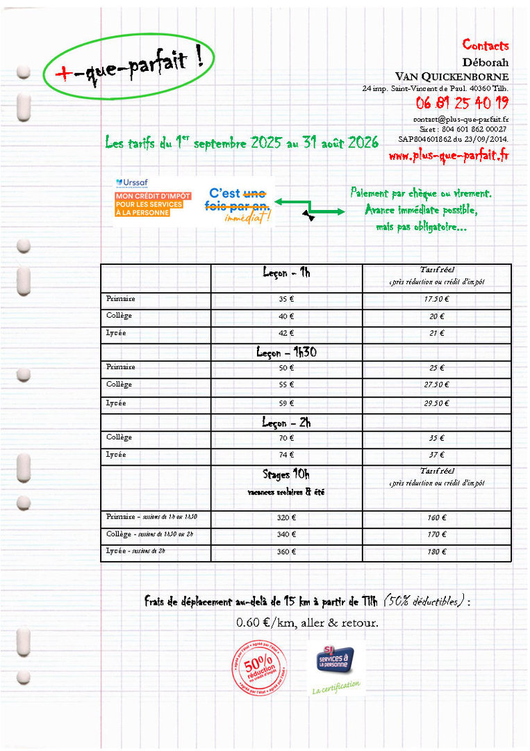 (50% de réduction d'impôt sur le coût horaire charges sociales incluses, dans les conditions posées par l’art. 199 sexdécies du CGI, sous réserve de modification de la législation.)